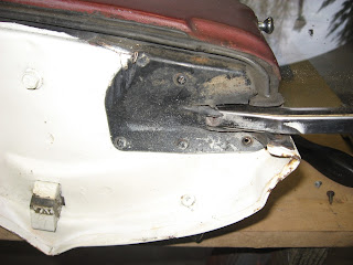 There are several window stops that need to be removed. The first is shown in the picture below. The small sheet metal part to the left of the hole with the screw in it was removed from the opening to it's right. The part went on the other side of the window base mounting plate (the metal part seen through the hole) and the small bolt held it on.